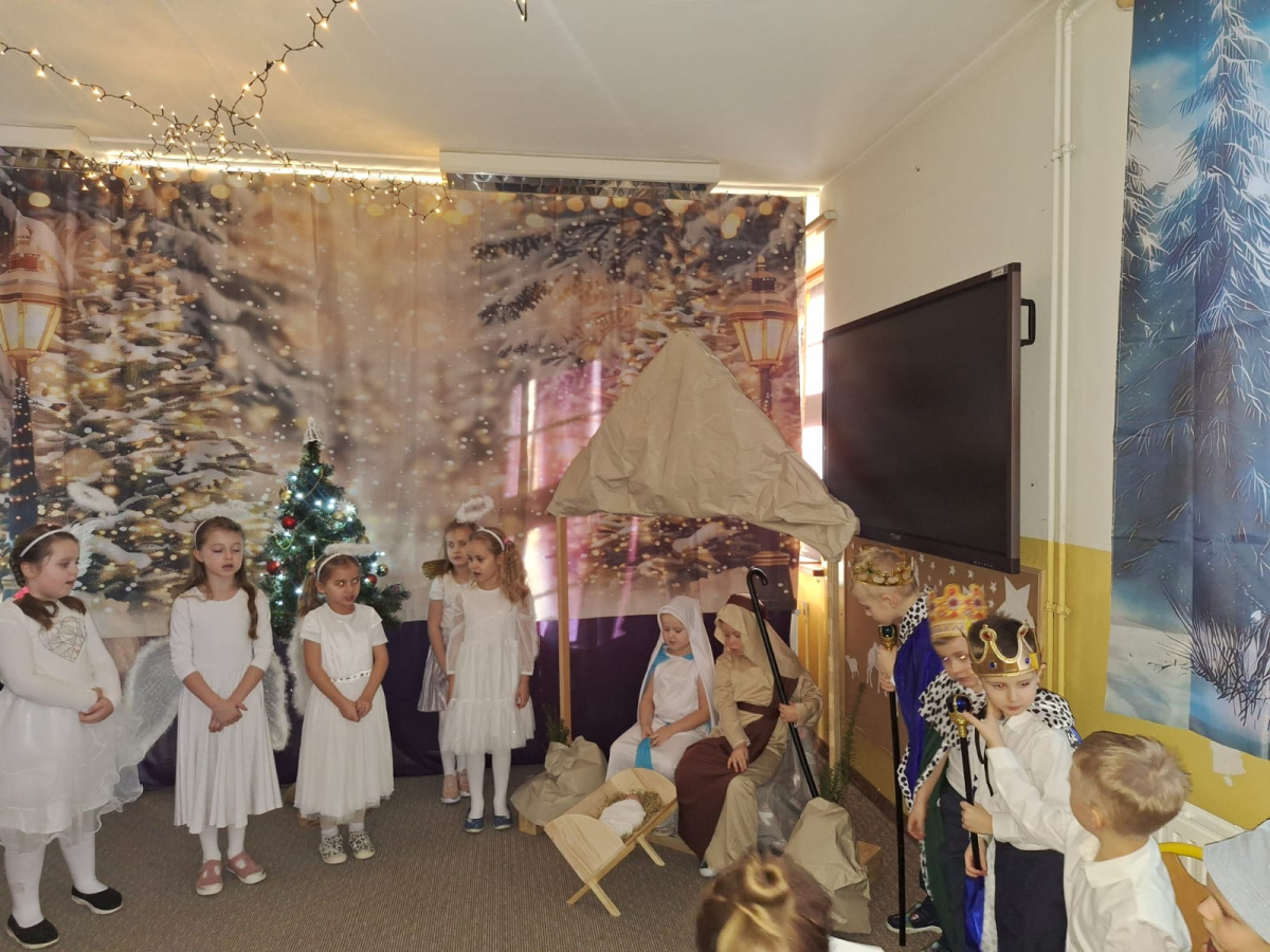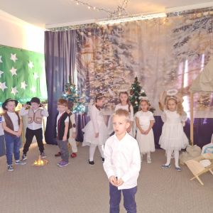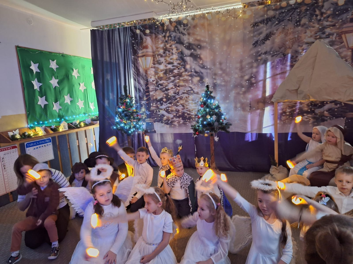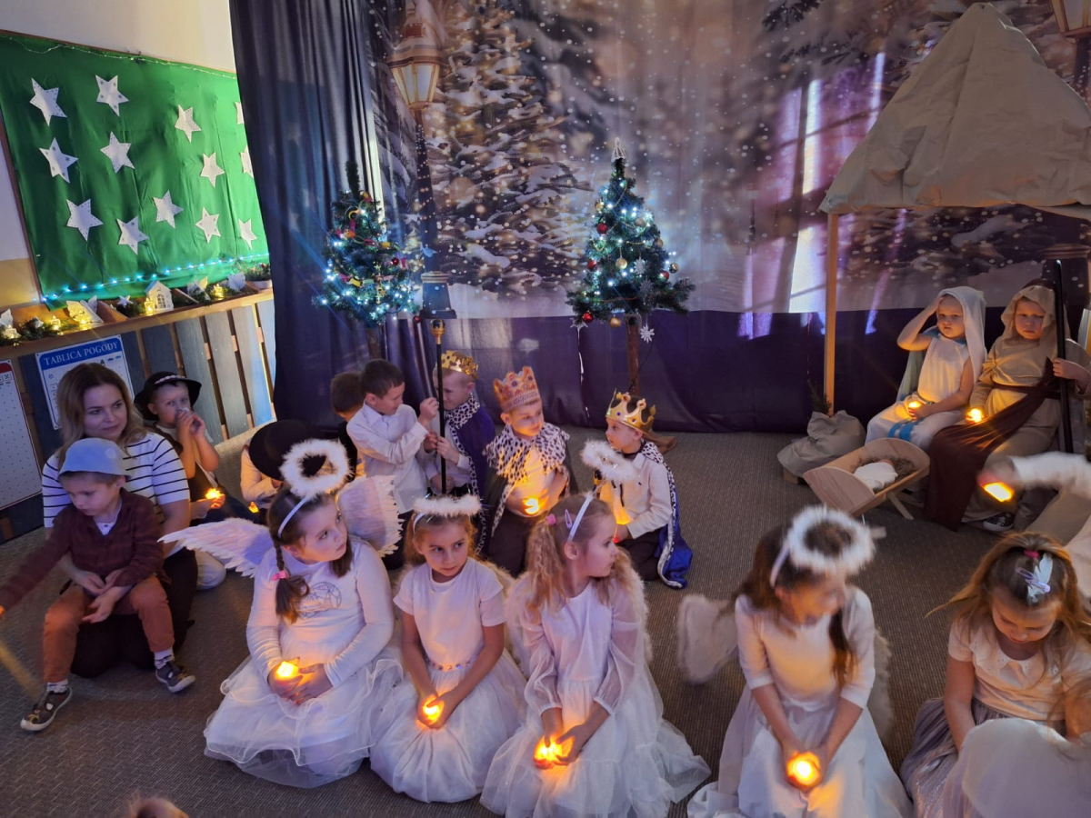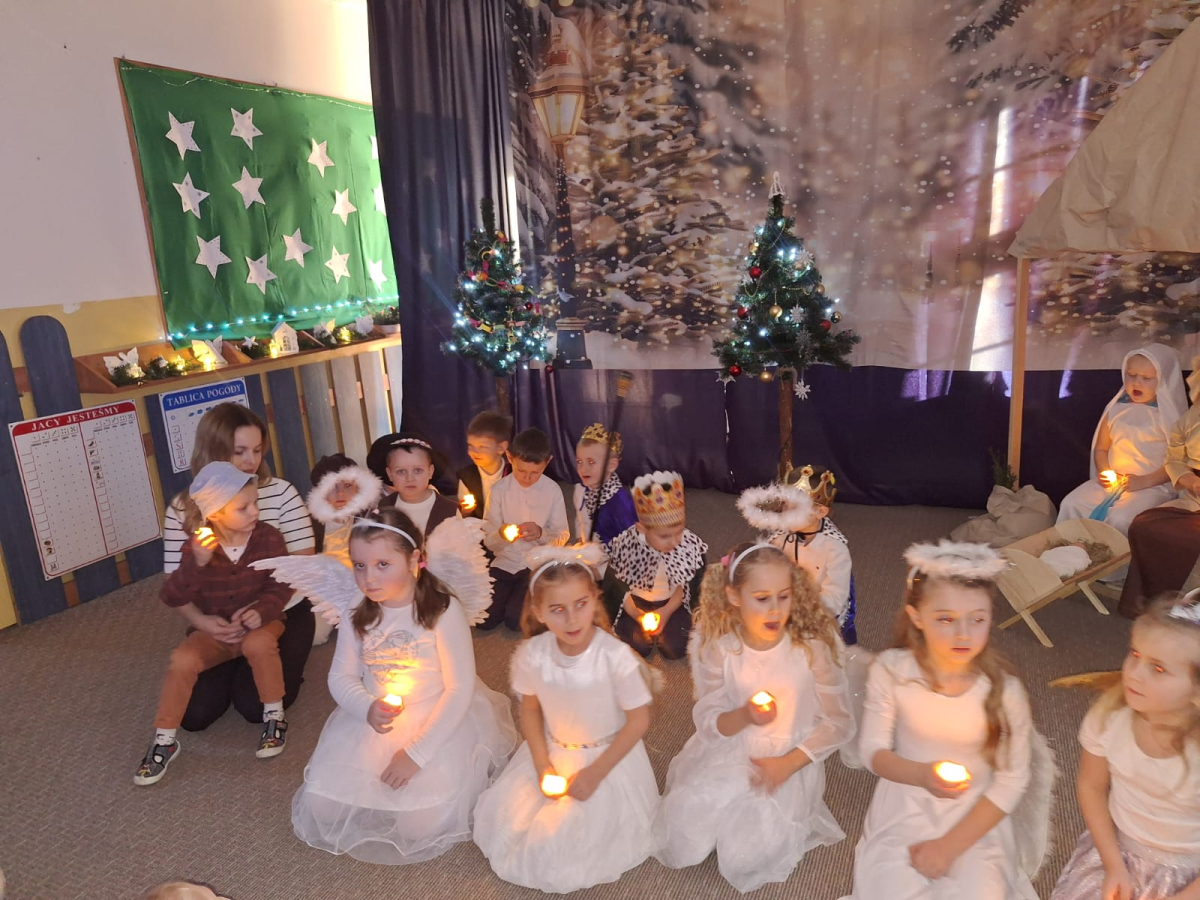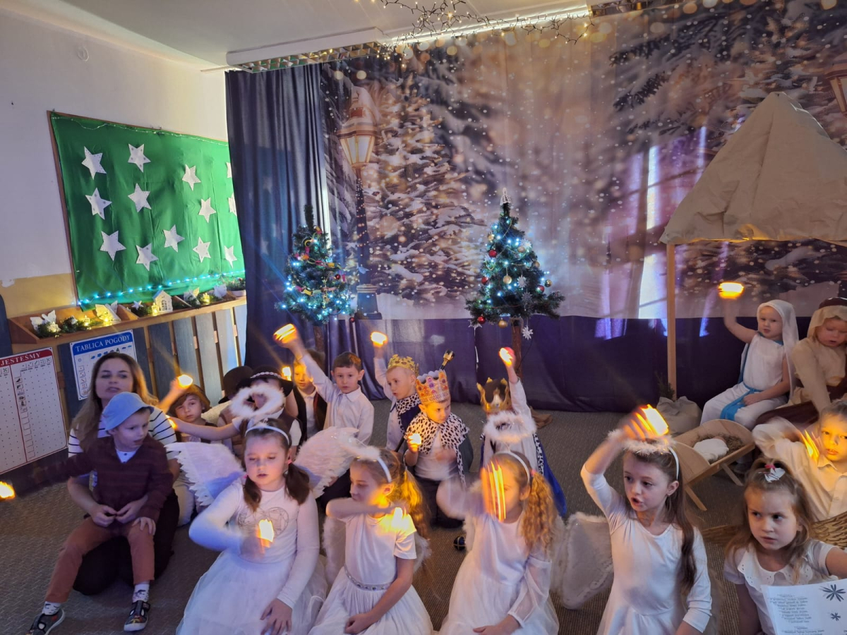 18 grudnia 2025 roku w naszym przedszkolu odbyły się wyjątkowe Jasełka, które wprowadziły wszystkich w świąteczny, pełen wzruszeń nastrój. Dzieci z grupy ,,Sówki’’ z wielkim zaangażowaniem przygotowały piękne przedstawienie bożonarodzeniowe, prezentując swoje umiejętności aktorskie i recytatorskie. Młodsze przedszkolaki uświetniły uroczystość wspólnym śpiewem, który dodał wydarzeniu niezwykłego uroku i ciepła. Całość przepełniona była radością, serdecznością oraz magią Świąt Bożego Narodzenia. Po części artystycznej odbyła się przedszkolna Wigilia – czas wspólnego świętowania, składania życzeń i dzielenia się radością przy świątecznym stole. Był to piękny moment integracji całej społeczności przedszkolnej, pełen życzliwości, bliskości i świątecznej atmosfery.