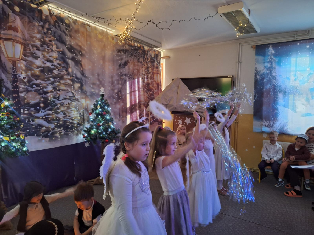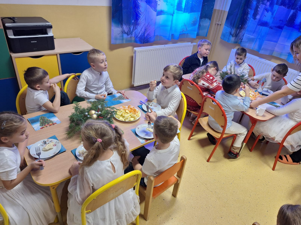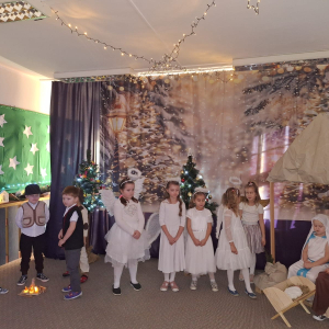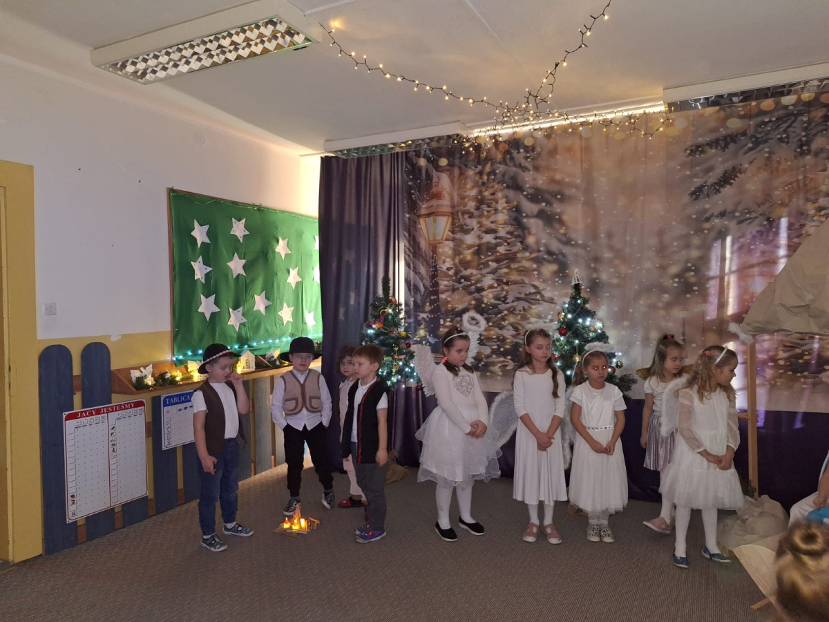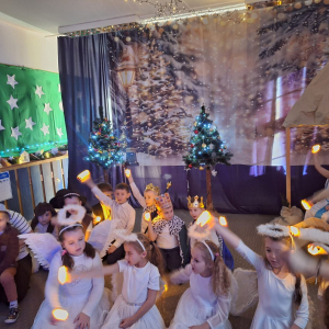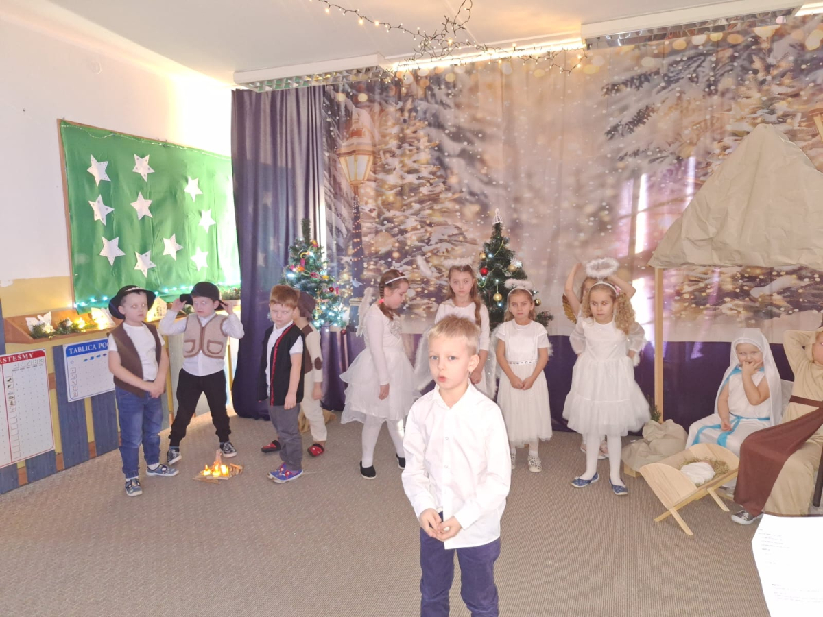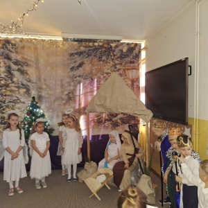 18 grudnia 2025 roku w naszym przedszkolu odbyły się wyjątkowe Jasełka, które wprowadziły wszystkich w świąteczny, pełen wzruszeń nastrój. Dzieci z grupy ,,Sówki’’ z wielkim zaangażowaniem przygotowały piękne przedstawienie bożonarodzeniowe, prezentując swoje umiejętności aktorskie i recytatorskie. Młodsze przedszkolaki uświetniły uroczystość wspólnym śpiewem, który dodał wydarzeniu niezwykłego uroku i ciepła. Całość przepełniona była radością, serdecznością oraz magią Świąt Bożego Narodzenia. Po części artystycznej odbyła się przedszkolna Wigilia – czas wspólnego świętowania, składania życzeń i dzielenia się radością przy świątecznym stole. Był to piękny moment integracji całej społeczności przedszkolnej, pełen życzliwości, bliskości i świątecznej atmosfery.