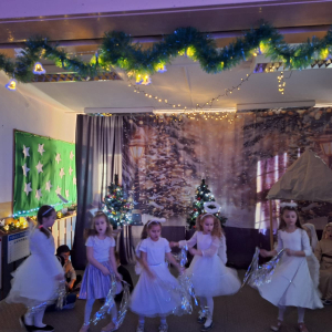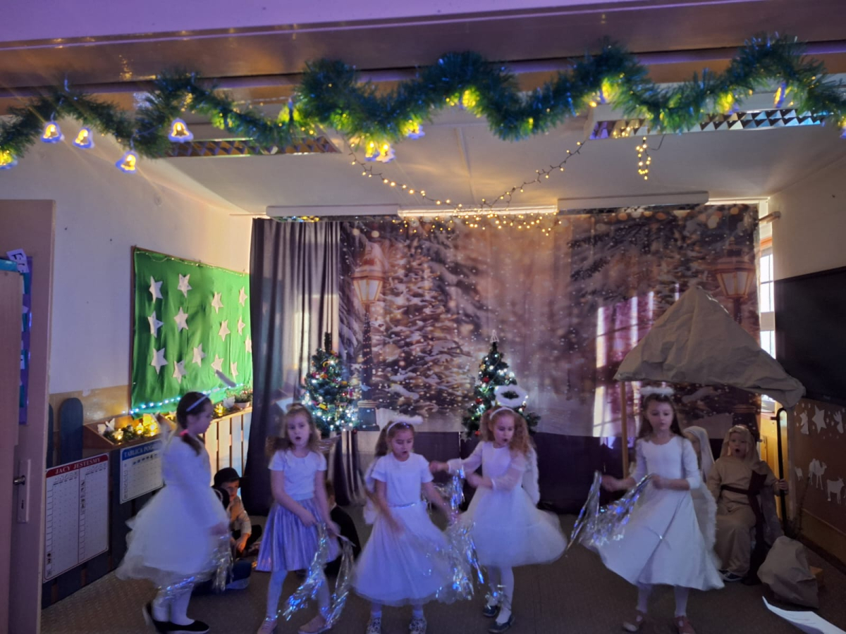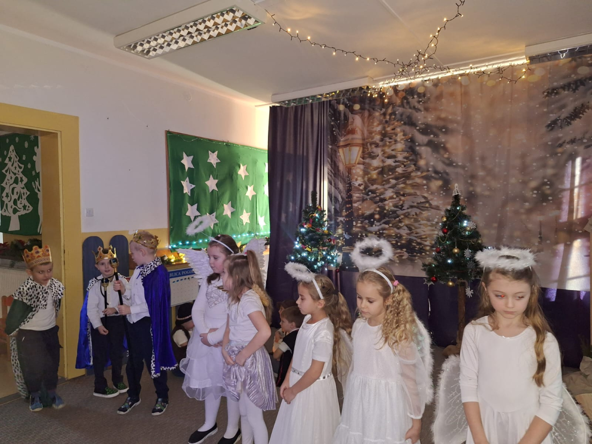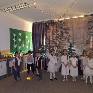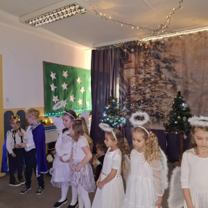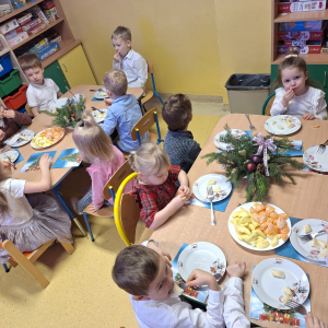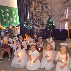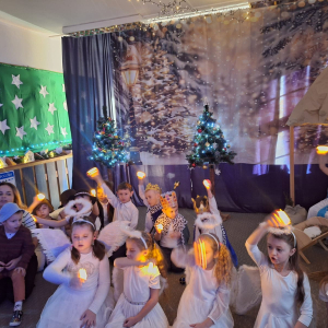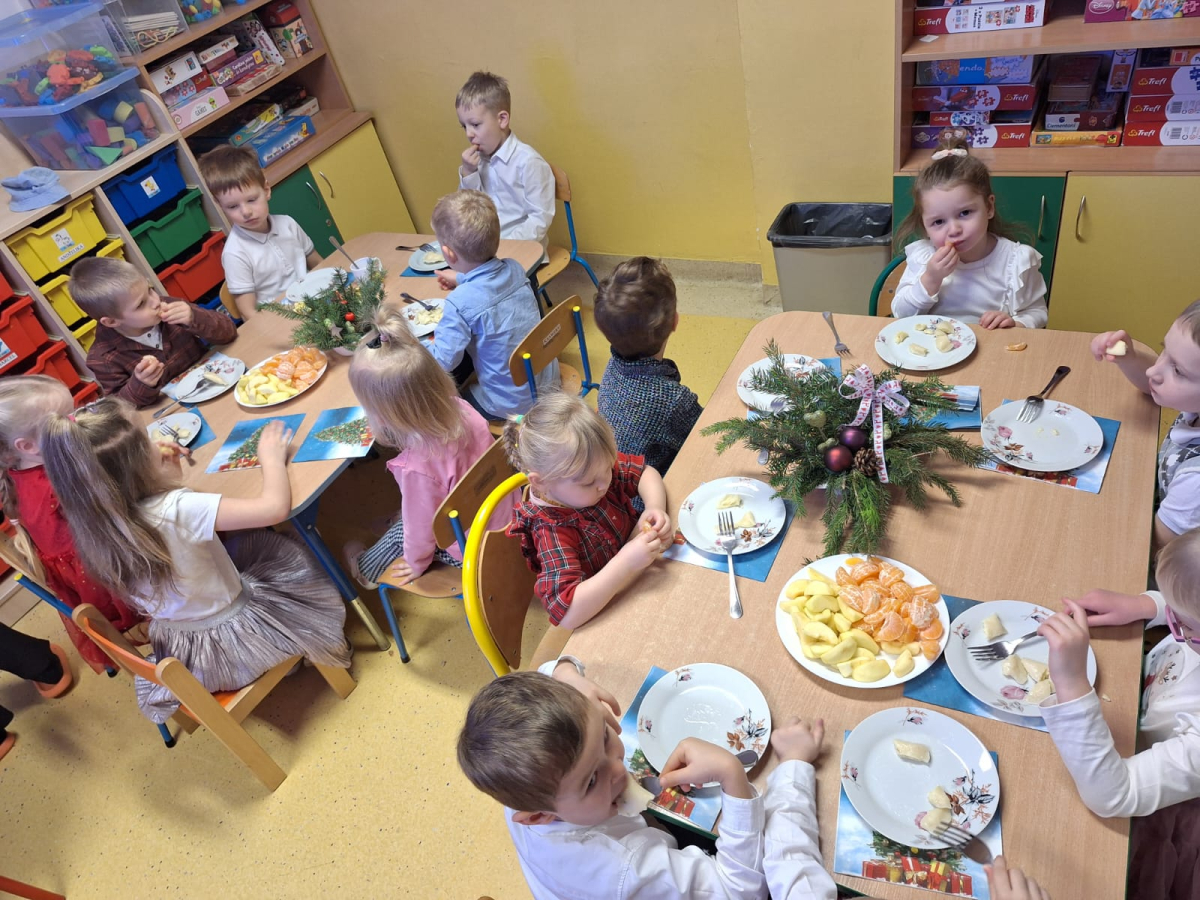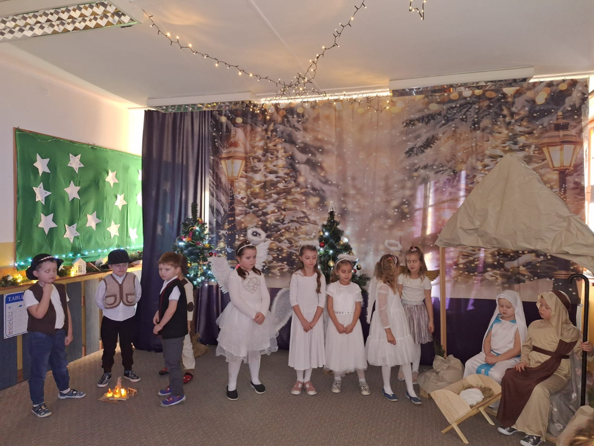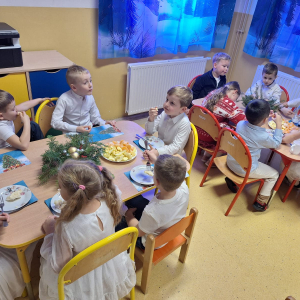 18 grudnia 2025 roku w naszym przedszkolu odbyły się wyjątkowe Jasełka, które wprowadziły wszystkich w świąteczny, pełen wzruszeń nastrój. Dzieci z grupy ,,Sówki’’ z wielkim zaangażowaniem przygotowały piękne przedstawienie bożonarodzeniowe, prezentując swoje umiejętności aktorskie i recytatorskie. Młodsze przedszkolaki uświetniły uroczystość wspólnym śpiewem, który dodał wydarzeniu niezwykłego uroku i ciepła. Całość przepełniona była radością, serdecznością oraz magią Świąt Bożego Narodzenia. Po części artystycznej odbyła się przedszkolna Wigilia – czas wspólnego świętowania, składania życzeń i dzielenia się radością przy świątecznym stole. Był to piękny moment integracji całej społeczności przedszkolnej, pełen życzliwości, bliskości i świątecznej atmosfery.