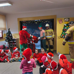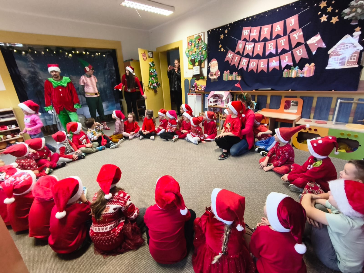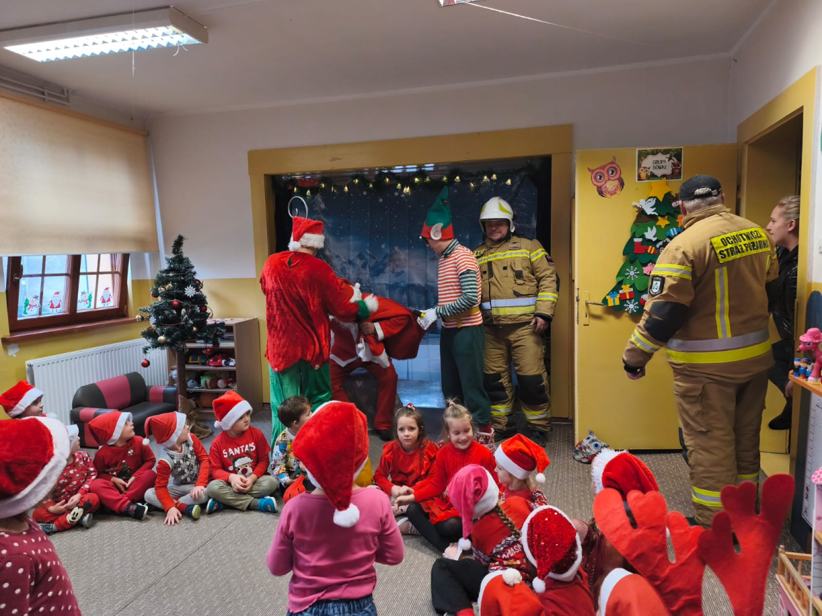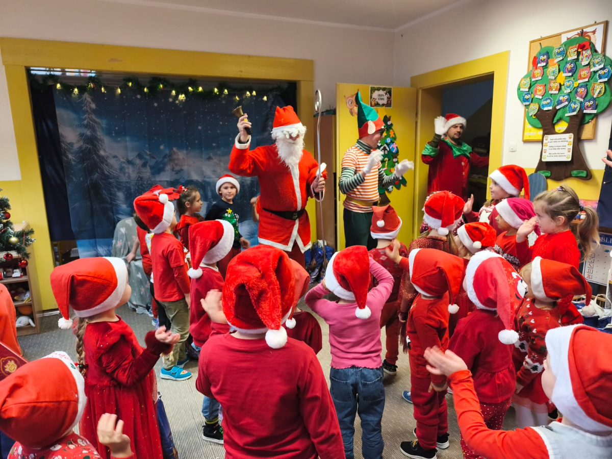 6 grudnia nasze przedszkole odwiedził długo oczekiwany i niezwykle miły gość! Mimo braku białego puchu za oknem, Mikołaj dotarł do nas na czas dzięki pomocy naszych strażaków. To dzięki nim do naszego przedszkola wróciła choinka którą ukradł Grinch. Mikołaj przyniósł ze sobą ogromny worek pełen prezentów i mnóstwo uśmiechu. Przedszkolaki powitały gościa piosenkami i wierszykami, a na twarzach wszystkich malowała się wielka radość i przejęcie. Mikołaj rozmawiał z dziećmi, zachęcał, by były grzeczne i słuchały rodziców oraz pań, po czym osobiście wręczył każdemu dziecku paczkę z upominkiem. To był dzień pełen magii i niezapomnianych wrażeń!