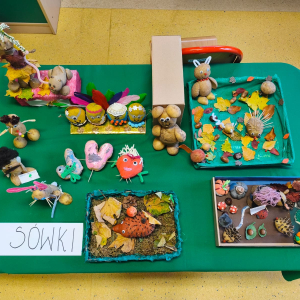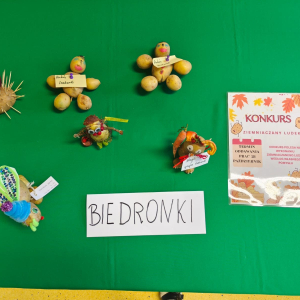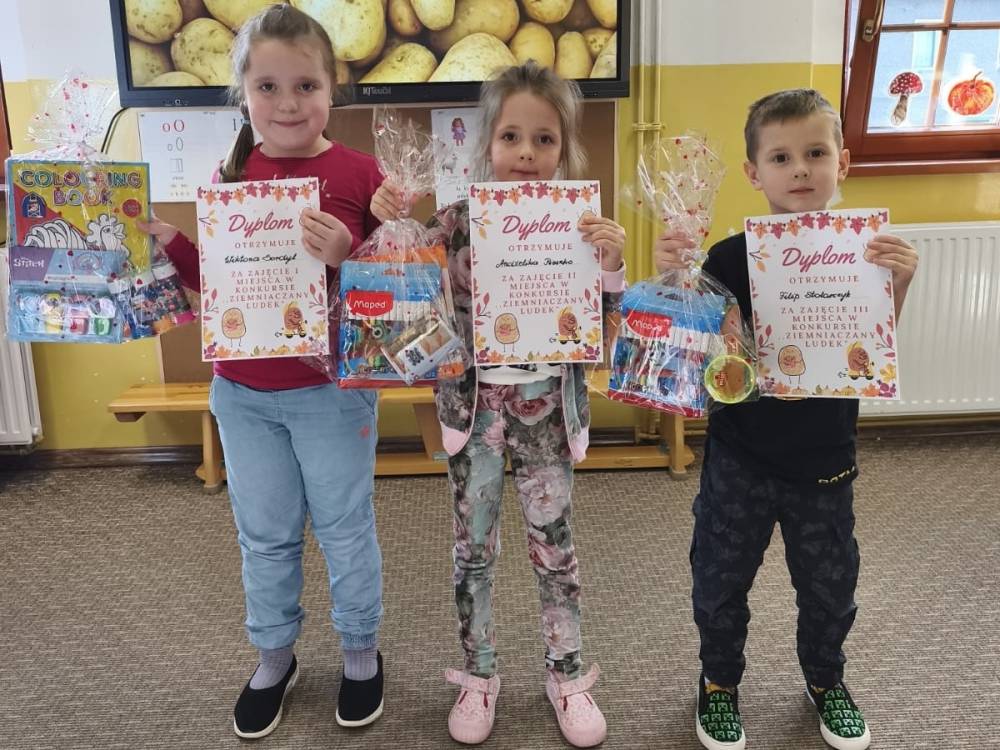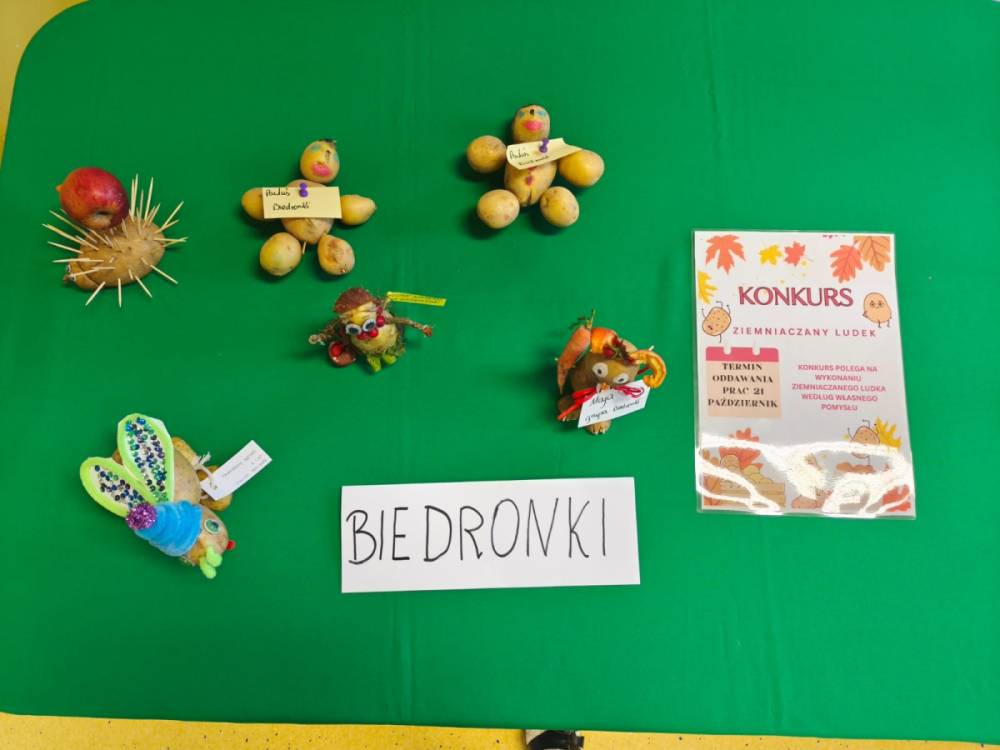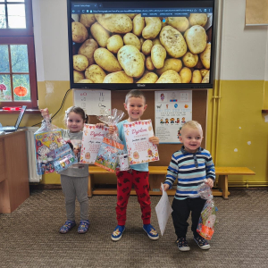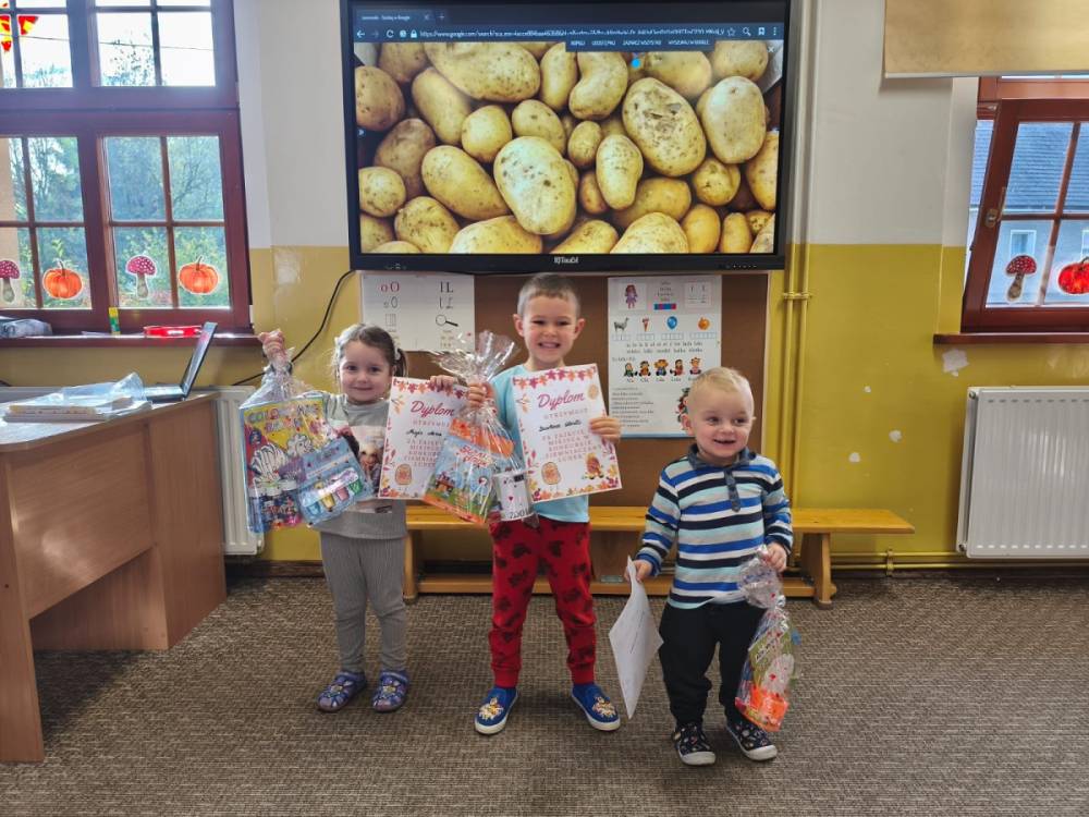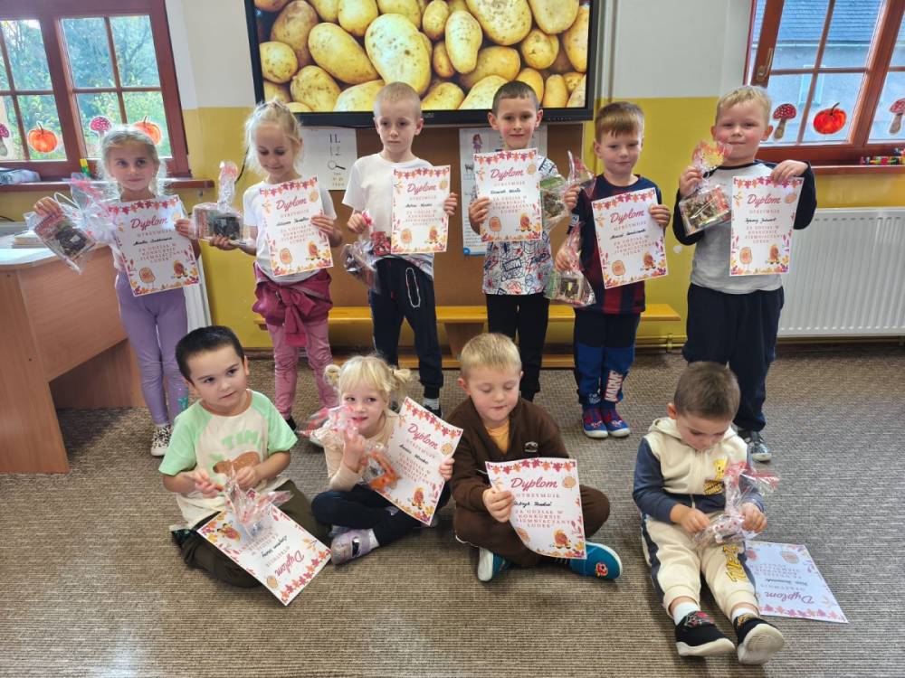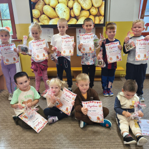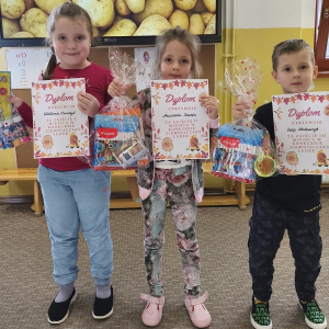 W naszym przedszkolu przeprowadzono konkurs o tematyce jesiennej pt.:,, Ziemniaczany ludzik’’. Zadaniem dzieci było wykonanie pracy, używając ziemniaków. Zarówno w grupie młodszej w ,, Biedronkach’’, jak i starszej w ,, Sówkach’’ nie brakowało chętnych do stworzenia ziemniaczanych cudów. Wyłoniono zwycięzców w grupie młodszej: Maja Misa – I miejsce, Bartosz Wcisło- II miejsce, Julian Kolonko- III miejsce. W starszakach: Wiktoria Sordyl- I miejsce, Andżelika Pieszko- II miejsce, Filip Stolarczyk- III miejsce. Wyróżnienia otrzymali: Marcel Czechowski, Marta Sobkowicz, Patryk Pawluś, Oliwia Pawluś, Szymon Ważny, Liliana Pudełko, Ignacy Jakwert, Amelia Woszko, Antoni Woszko, Filip Rozworski, Dominik Wcisło. Wszystkim przedszkolakom i ich rodzicom dziękujemy za udział i kreatywność.